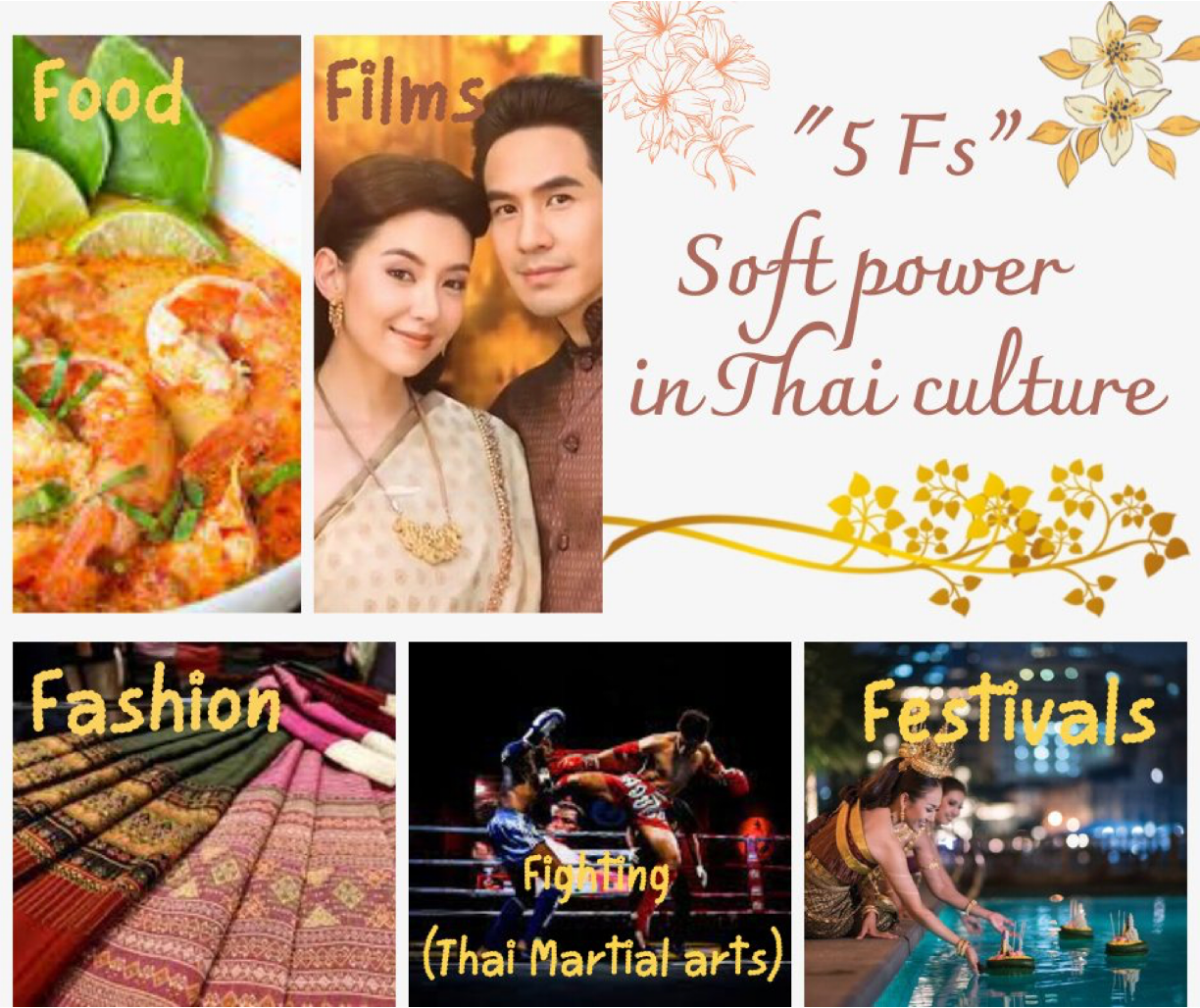 Thailand, known as the “Land of Smiles,” is a country rich in culture and tradition. Recognizing the potential of its cultural heritage, the Thai government has launched an initiative known as “Thailand’s 5 F’s soft power,” which aims to promote five major Thai cultures to international audiences, i.e. food, films, fashion, fighting (Muay Thai), and festivals.
