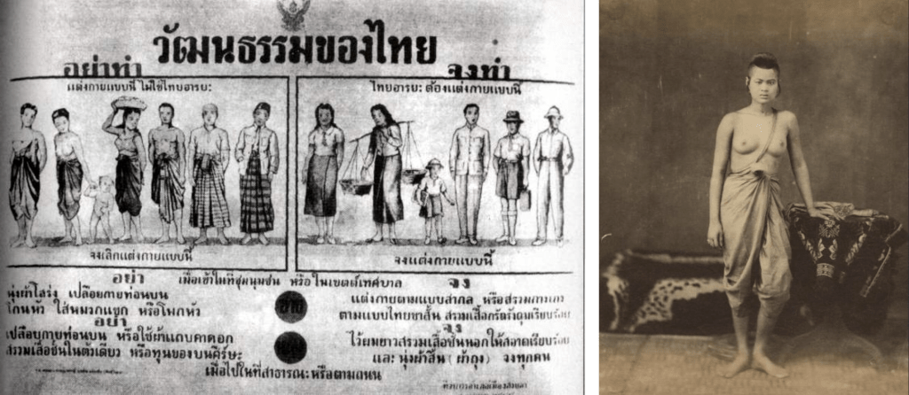 Before the year 1941 (B.E. 2484), it was not uncommon for Thai women to go topless and sport short hair, much like their male counterparts as was typical for people living in tropical climates. However, this changed under the leadership of Prime Minister Plaek Phibunsongkhram, who introduced new policies and laws aimed at unifying and modernizing the country including making women cover up their breasts and wear their hair long.