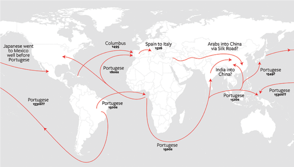 Sources: (1) A BRIEF HISTORY OF CHILI PEPPERS, LegalNomads.com, 17 JAN 2022; (2) Papaya – American Indian Health and Diet Project, Scott Han Sheu; (3) รู้ยัง? มะละกอ มาจากเมือง “มะละกา” แต่แปลว่า “มะขามป้อม”งงไหม ?, MatichonOnline.com, 13 FEB 2017; (4) มะละกอ แหล่งกำเนิด เส้นทางการกระจายพันธุ์, BioThai.net, 4 JAN 2023; (5) ส้มตำทำไมไม่เรียกมะละกอตำ, Guru.Sanook.com, 26 NOV 2013; “มะละกอ” พืชต่างถิ่นเข้าสู่ไทยเมื่อใด? ทำไมคนอีสานเรียกว่า “บักหุ่ง”, Silpa-mag.com
