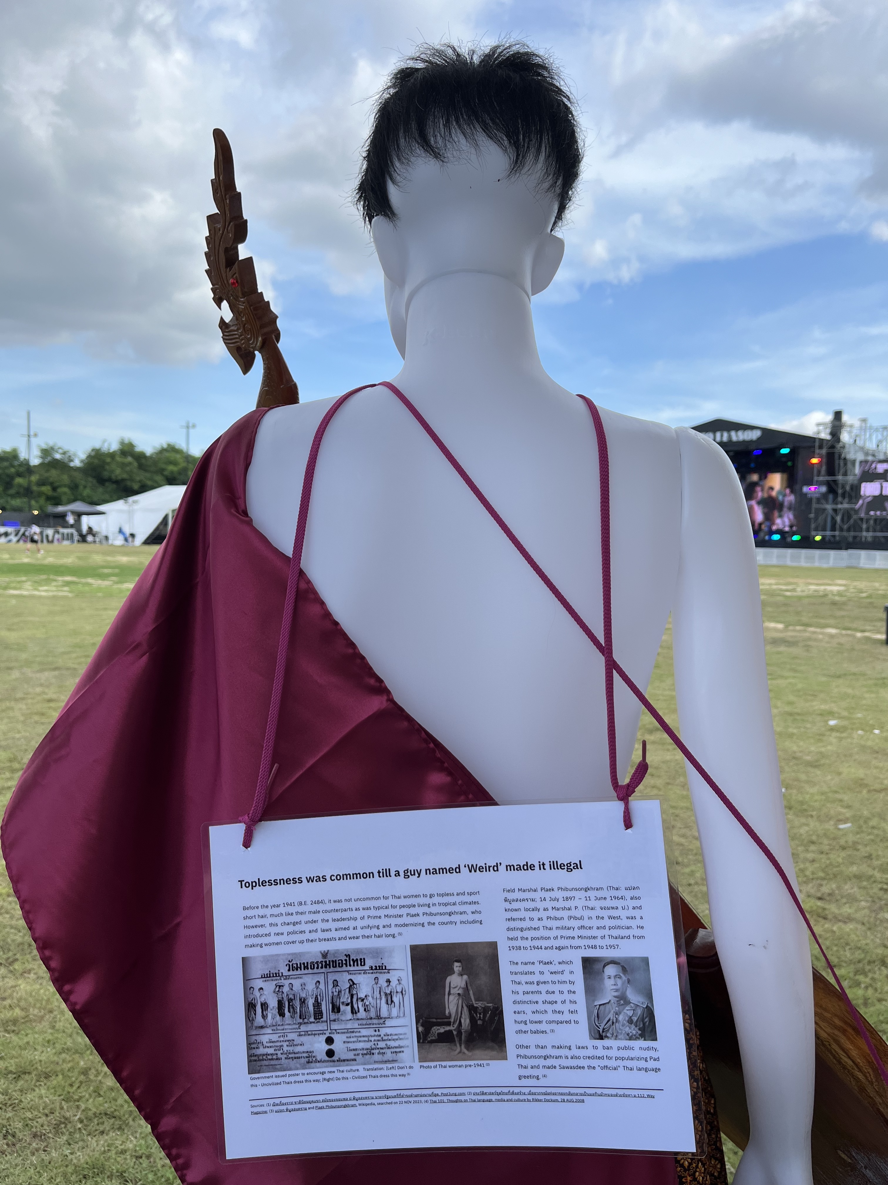 Sources: (1) เปิดเรื่องราว! ชาตินิยมยุคแรก สมัยของจอมพล ป.พิบูลสงคราม นายกรัฐมนตรีที่ดำรงตำแหน่งนานที่สุด, PostJung.com; (2) ประวัติศาสตร์ชุดไทยที่เพิ่งสร้าง: เมื่ออาภรณ์แห่งอารยะกลับกลายเป็นมลทินมัวหมองด้วยข้อหา ม.112, Way Magazine; (3) แปลก พิบูลสงคราม and Plaek Phibunsongkhram, Wikipedia, searched on 22 NOV 2023; (4) Thai 101: Thoughts on Thai language, media and culture by Rikker Dockum, 28 AUG 2008