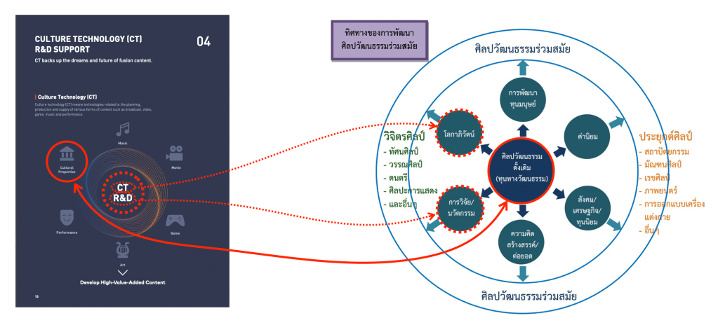 The Korea Creative Content Agency, or KOCCA, a South Korean government agency, is responsible for developing innovations in contemporary culture. Its development policy centers on Cultural Technology, Research and Innovation, or CT R&D, as the core of content development, with traditional cultural properties as one of the components. This contrasts with the direction of contemporary cultural development in Thailand, which definitively stipulates that it must be developed with traditional culture, interchangeable with the word “cultural capital” at the center whilst technology, research, and innovation must support it to become a “contemporary culture”.