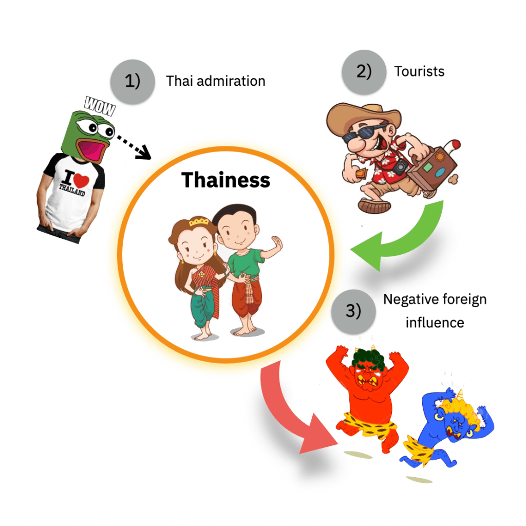 - It seems that the government sees that various foreign influences flowing into Thailand deteriorates the morality and ethics of Thai people; thus, believe that the way to solve this problem is to promote Thainess (ความเป็นไทย) in terms of religion, art and culture of the nation, and local wisdom.