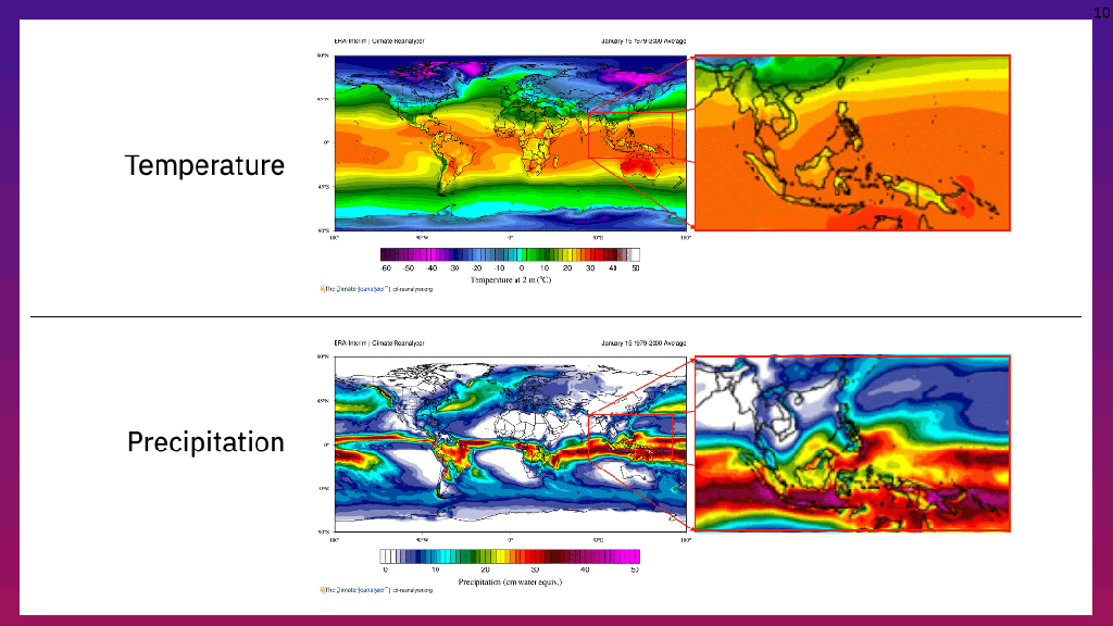 พอเห็นดังนี้ ก็เลยได้มาพบว่าเอเชียตะวันออกเฉียงใต้นั้นมีโซนภูมิอากาศ 2 โซนด้วยกัน คือ ตะวันออกเฉียงใต้ที่มีอินโดนีเซีย มาเลเซีย บรูไน สิงคโปร์ และฟิลิปปินส์ตอนใต้ กับตะวันตกเฉียงเหนือที่มีไทย เมียนมาร์ ลาว กัมพูชา เวียดนาม และฟิลิปปินส์ตอนเหนือ ซึ่งจะมีสภาพอากาศตรงข้ามกัน คือ ถ้าฝั่งหนึ่งมีมรสุม อีกฝั่งจะแล้งนั่นเอง