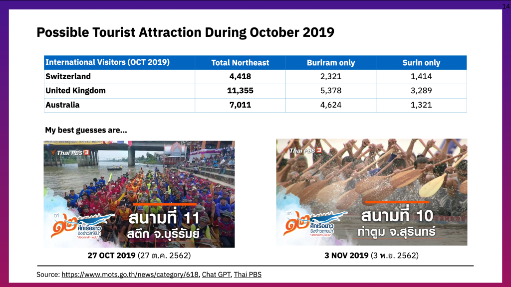 จาก Heat Map ผมสังเกตเห็นว่ามี data ที่ดูแปลกและน่าสนใจอยู่ 2 จุด คือ ภาคตะวันออกเฉียงเหนือซึ่งปรกติแล้วไม่ค่อยมีนักท่องเที่ยวชาวตะวันตกไปเที่ยวมากนัก แต่ปรากฏว่าในเดือนตุลาคมกลับมีนักท่องเที่ยวชาวสวิสเซอร์แลนด์ สหราชอาณาจักร และออสเตรเลียมากกว่าเดือนอื่น ๆ ผมจึงพยายามหาว่ามีเหตุการณ์ใดที่น่าจะดึงดูดนักเที่ยวเหล่านั้นไปภาคตะวันออกเฉียงเหนือบ้างหรือไม่ และจากการเจาะข้อมูลลึกลงไปอีก ก็ทำให้พบว่าจังหวัดที่คนเหล่านี้ไปนั้น คือ บุรีรัมย์ และสุรินทร์