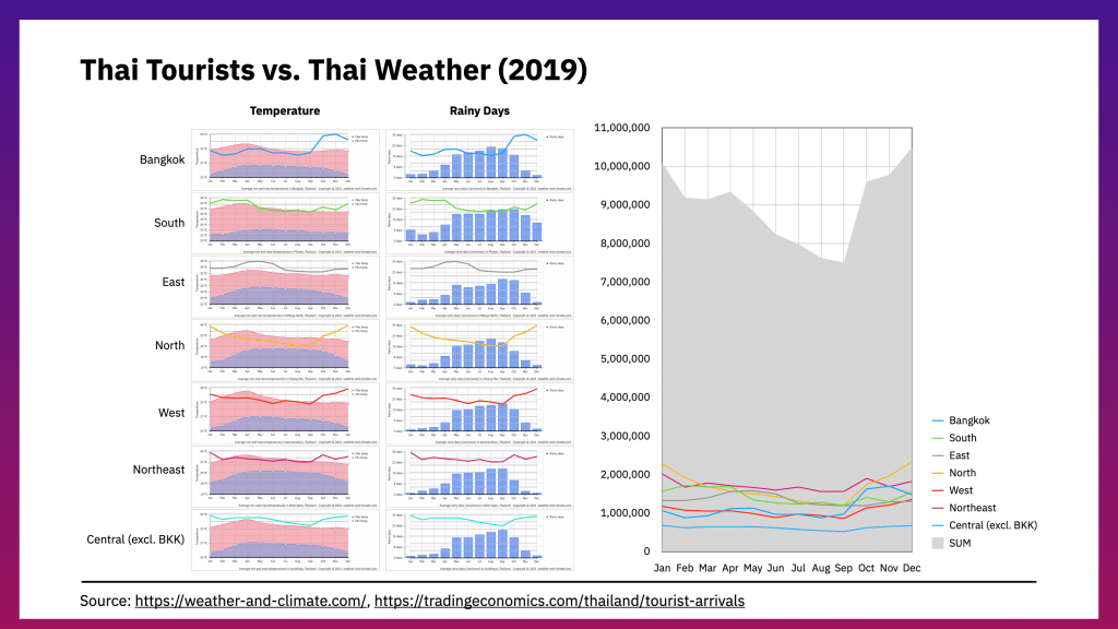 Source: Guest Arrivals at Accommodation Establishments (2019) by mots.go.th; Travel periods of different regional peoples searched by Chat GPT.